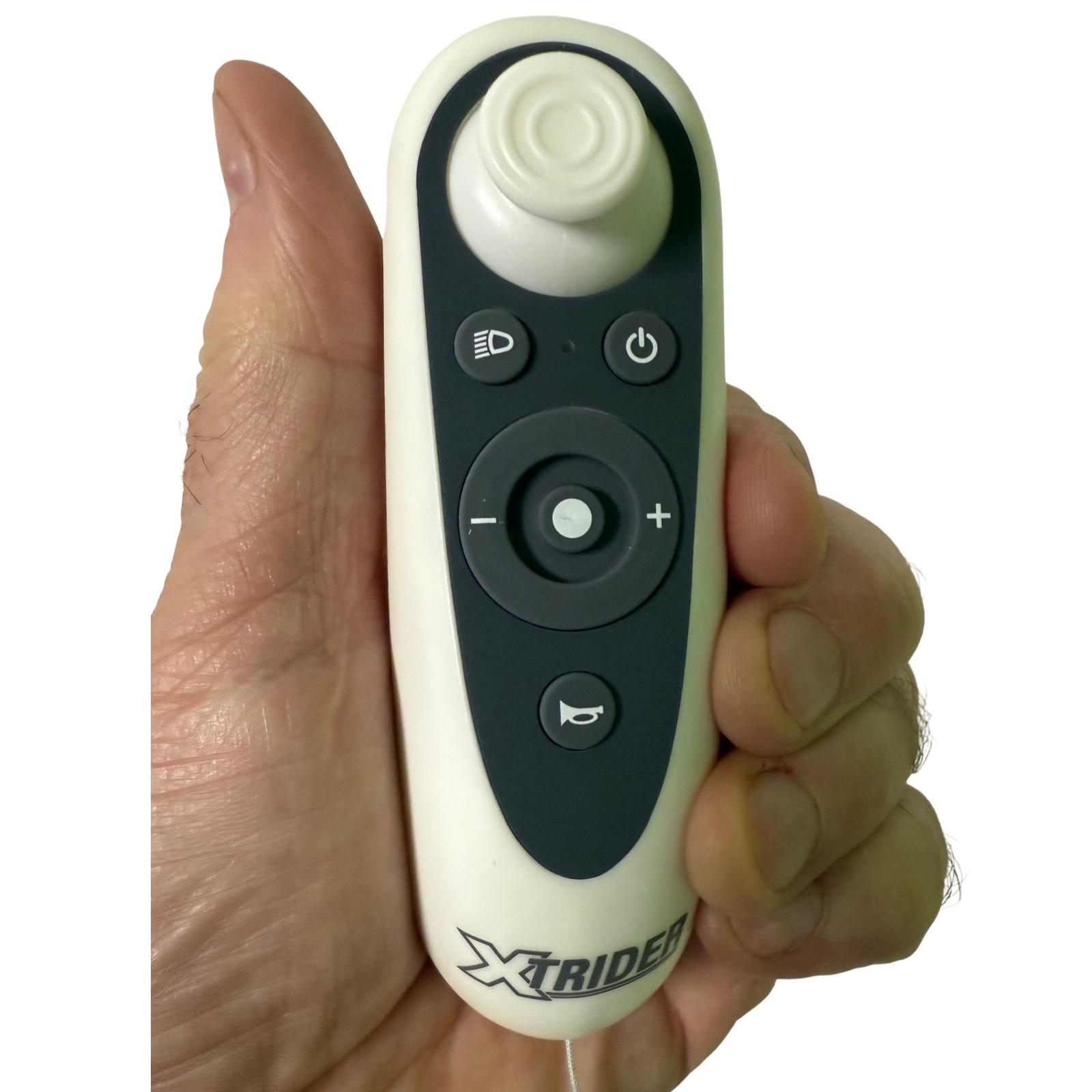 Remote Control fob for Xtrider. The remote fob allows the buggy to drive forward and backwards and steer left and right. In other words the buggy can be fully controlled at a distance by the hand remote. The speed can be adjusted on the fob allowing for precise movements if required. This allows the user to walk ahead or behind the buggy, whilst still controlling it. Especially useful when calling the buggy to the green or moving to the next hole. System uses Bluetooth technology and gives a working range of around 300yrds. If the buggy goes out of range it will come to a stop awaiting instruction. Note: This option can only be added to V5 Xtrider or later.